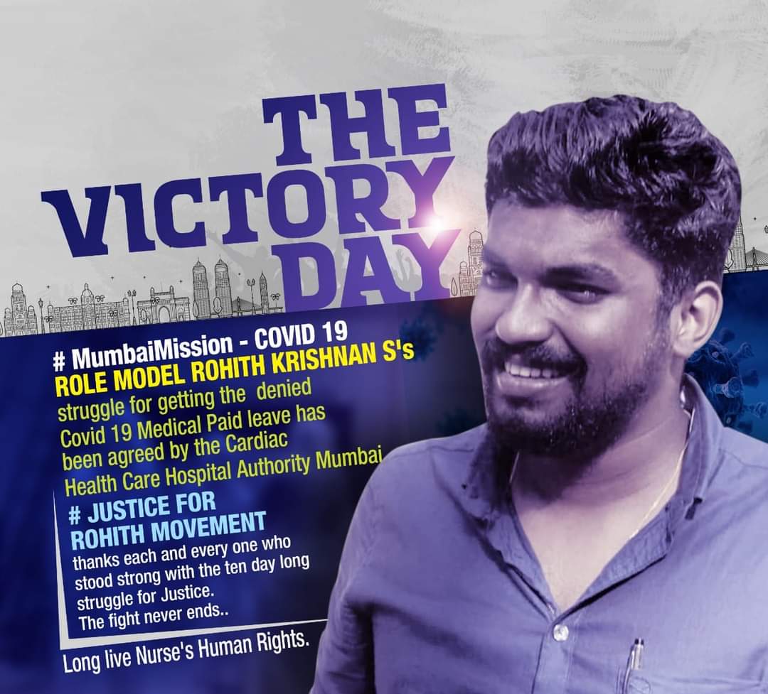 ഏഷ്യാനെറ്റ് ന്യൂസ് നേരിൽ പോയി മഹാരാഷ്ട്ര ആരോഗ്യ മന്ത്രിയെ കണ്ടു കാര്യങ്ങൾ അവതരിപ്പിച്ചു അതൊരു വല്യ ട്വിസ്റ്റ് അയിരുന്നു ആരോഗ്യ മന്ത്രി രാജേഷ് ടോപ്പേ സാർ കാര്യത്തിൽ വേണ്ട ഇടപെടൽ ഉറപ്പ് നൽകി, ഇനി മറ്റൊരു നഴ്സിനും ഈ ഒരു പ്രശ്നം ഉണ്ടാകില്ല എന്നും ഉറപ്പ് നൽകി. MPCC സെക്രട്ടറി Jojo Thomas സർ വേണ്ട ഇടപെടൽ നടത്തി കാര്യങ്ങൾ മുംബൈ കോർപറേഷനിലും ആശുപത്രി ഡീൻ ഇനെയും ധരിപ്പിച്ചു.അങ്ങനെ എല്ലാ രീതിയിലും നാലു വഴി നമ്മൾ കാര്യങ്ങൾ നീക്കിയെപ്പോൾ നമ്മുടെ വിജയം നമ്മൾ ഉറപ്പിച്ചു. ജനുവരി 4 ന് UNA മഹാരാഷ്ട്ര പ്രസിഡന്റ് Jibin T C ഇവിടെ വന്നിരുന്നു. ജനുവരി 4,5 തിയതികൾ ഞാനും ആശുപത്രി മാനേജ്മെന്റും ആയി ചർച്ചകൾക്ക് ശേഷം അവർ എനിക്ക് കോവിഡ് ബാധിച്ച അന്നു മുതൽ ഉള്ള എല്ലാ സാലറിയും തന്ന് സെറ്റിൽ ചെയ്തു എഗ്രിമെന്റ് ആയി. നമ്മൾ വീണ്ടും ഒരു ചരിത്രം രചിച്ചു. ഇത് നമ്മുടെ വിജയം ഞാൻ ഇതിന്റെ ഒരു ഭാഗം മാത്രം അയിരുന്നു നമ്മൾ എല്ലാരും കൂടെ ആണ് ഇത് നേടിയത്.