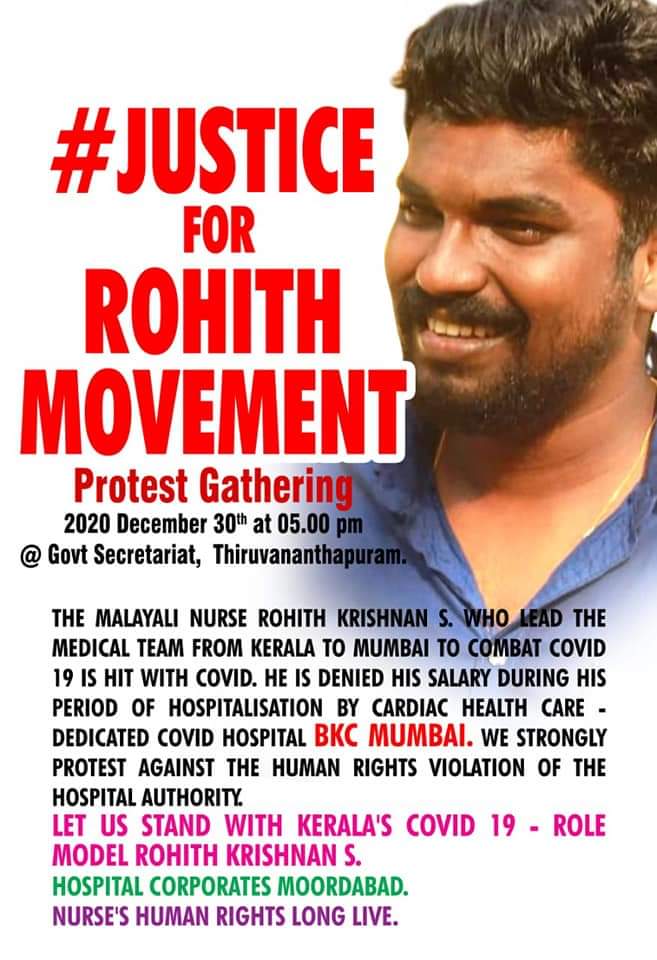 കേരളത്തിൽ നിന്നുള്ള ഒരു സംഘം ആരോഗ്യപ്രവർത്തകരുടെ കൂട്ടായ്മ മുംബൈയിൽ നടത്തിയ കൊവിഡ് 19 പ്രതിരോധ പ്രവർത്തനങ്ങളുടെ പ്രധാന നേതൃത്വമായിരുന്നു മുൻ ആരോഗ്യ സർവ്വകലാശാല സെനറ്റ് അംഗവും നഴ്സുമായ Rohith Alpy. 2020 സെപ്തംബർ 3 മുതൽ Cardiac Health Care (Mumbai) എന്ന Dedicated Covid Center ലെ ICU ൽ സീനിയർ ഡ്യൂട്ടി നഴ്സായി അദ്ദേഹം ജോലി ചെയ്തുവരികയായിരുന്നു. ഡിസംബർ 8 ന് കോവിഡ് കൊവിഡ് പൊസിറ്റീവായി അഡ്മിറ്റ്ഡായ രോഹിത് 20 നാണ് ഡിസ്ചാർജ്ജ് ചെയ്യപ്പെടുന്നത്. ഡോക്ടർമാർ ജനുവരി 3 വരെ ക്വാറന്റൈനും വിശ്രമവും നിർദ്ദേശിച്ചിരുന്നു.കൊവിഡ് സംബന്ധമായ റിപ്പോർട്ടുകൾക്കൊപ്പം ആശുപത്രി അധികൃതർക്ക് മെഡിക്കൽ ലീവിനായി request ഇ - മെയിൽ ചെയ്തുവെങ്കിലും കോൺട്രാക്റ്റ് സ്റ്റാഫ് ആയതുകൊണ്ടും ഇതുവരേയ്ക്കും അവിടെ ജോലിചെയ്യുന്ന ആർക്കും മെഡിക്കൽ ലീവ് കൊടുത്തിട്ടില്ലാത്തതിനാലും അത് അനുവദിയ്ക്കാനാകില്ല എന്ന മറുപടിയാണ് ലഭ്യമായത്. PPE കിറ്റിനുള്ളിൽ ICU വിൽ ക്വാറന്റൈൻ പോലുമില്ലാതെ 12 മണിക്കൂർ ഡ്യൂട്ടി ചെയ്തുവരുന്ന രോഹിത് അടക്കമുള്ള ആതുര സേവന രംഗത്തെ കമ്മിറ്റഡായ ആരോഗ്യപ്രവർത്തകരെ ചൂഷണം ചെയ്യുന്ന നടപടിക്രമമാണ് മുംബൈയിലെ Cardiac Health Care ന്റേത്.